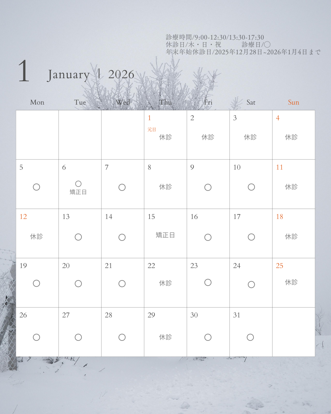 今回は、2026年1月の診療スケジュール・営業時間をまとめたカレンダー画像を掲載いたしました。患者様のご来院前に、ぜひ下記の内容をご確認いただき、安心してご予約いただける環境づくりに努めております。