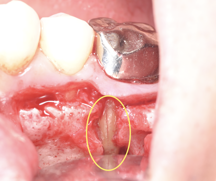 今回はラバーダムという治療中に細菌感染を防止するカバーをして、歯科用顕微鏡(マイクロスコープ)で神経内部が綺麗になっているかを確認してMTAセメントという薬剤を使用し治療を行いました。