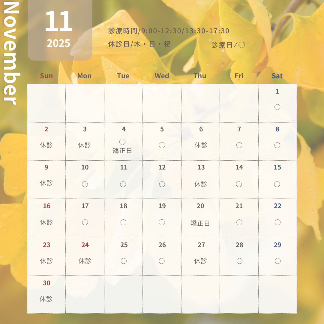 今回は、2025年11月の診療スケジュール・営業時間をまとめたカレンダー画像を掲載いたしました。患者様のご来院前に、ぜひ下記の内容をご確認いただき、安心してご予約いただける環境づくりに努めております。